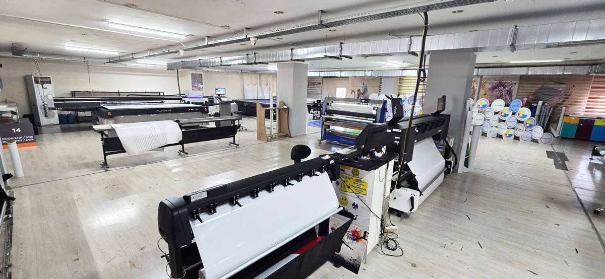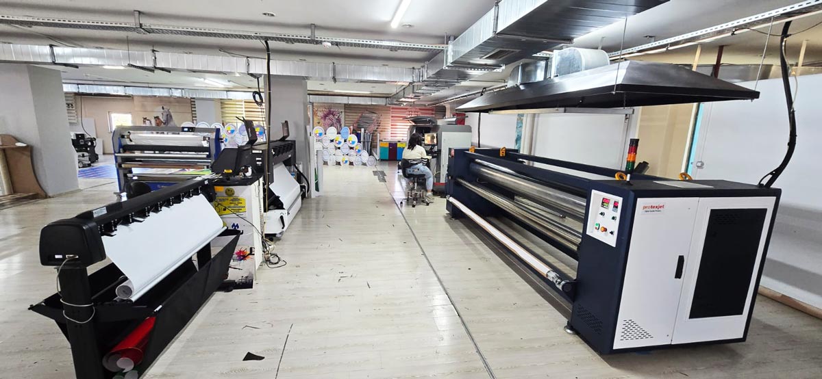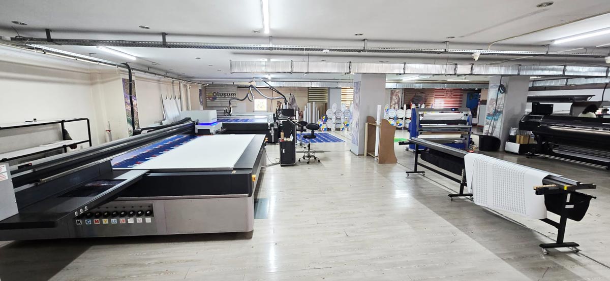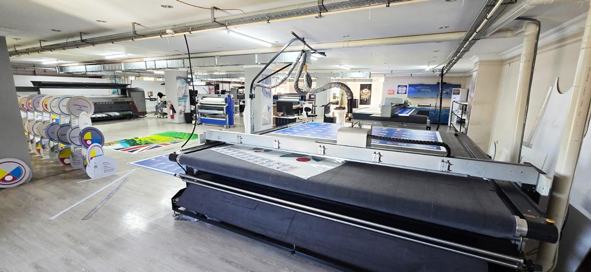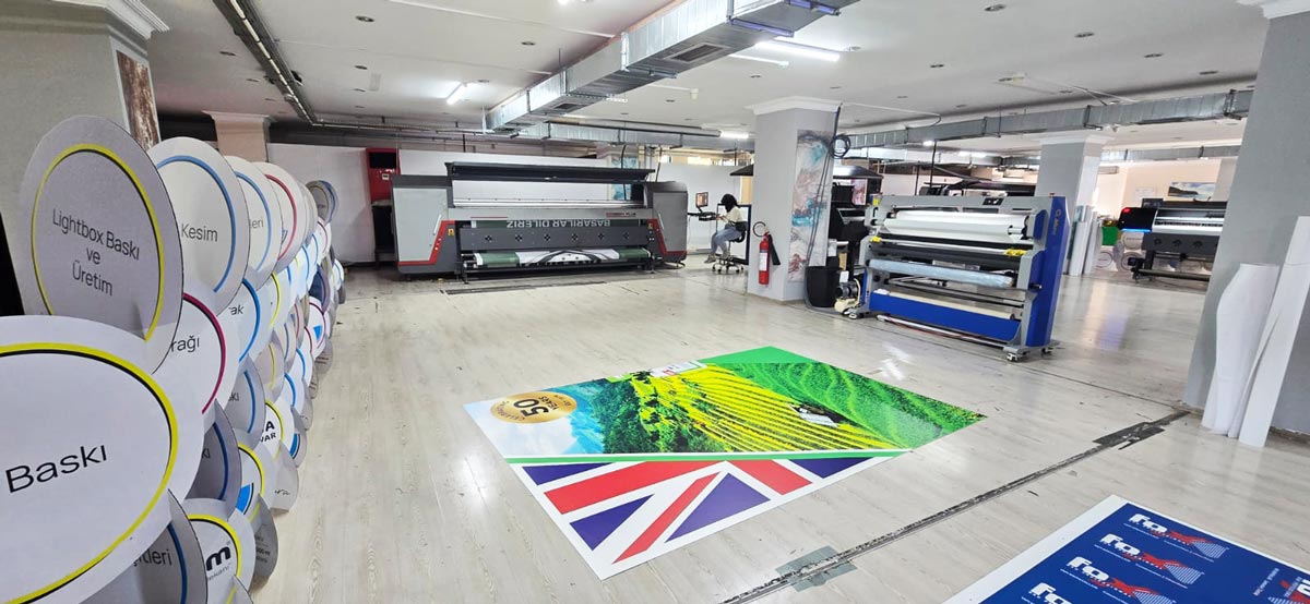 Yüksek teknolojili tekstil makinelerimizin olduğu bu katta aynı zamanda iç mekan baskı, sıcak soğuk laminasyon, bas-kes ve dijital kesici ile özel kesimler gerçekleştirdiğimiz hizmeti de sunuyoruz.